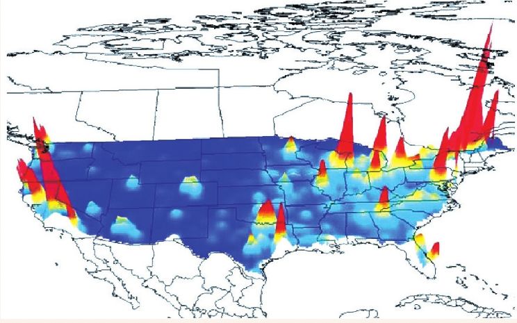 (图中橙色区域占据了美国经济的半壁江山,但在人均GDP的意义上,各区域间却能实现“平衡发展” 图源:陆铭《大国大城》)