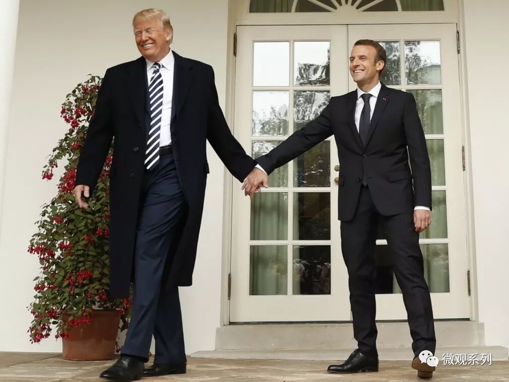 当时马克龙访问白宫,在媒体镜头前两人亲如穿同一条开裆裤长大的兄弟,还一起手牵手一步两步三步游白宫