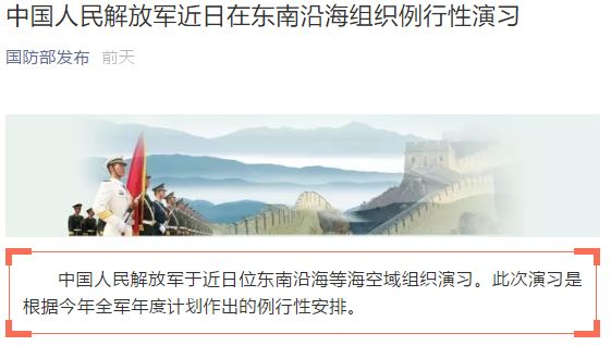 在美国宣布对台军售以及台湾各路人马决战2020大选时,中国国防部隆重宣布:中国人民解放军于近日位东南沿海等海空域组织演习。此次演习是根据今年全军年度计划作出的例行性安排。