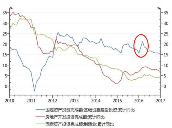 当时,央妈从货币工具箱里掏出了PSL大力支持棚改,财爸用专项建设基金积极搞基建,基建投资增速从跌势中大反转,很多人一度出现了“新周期”的幻觉,觉得经济已经触底反弹了。