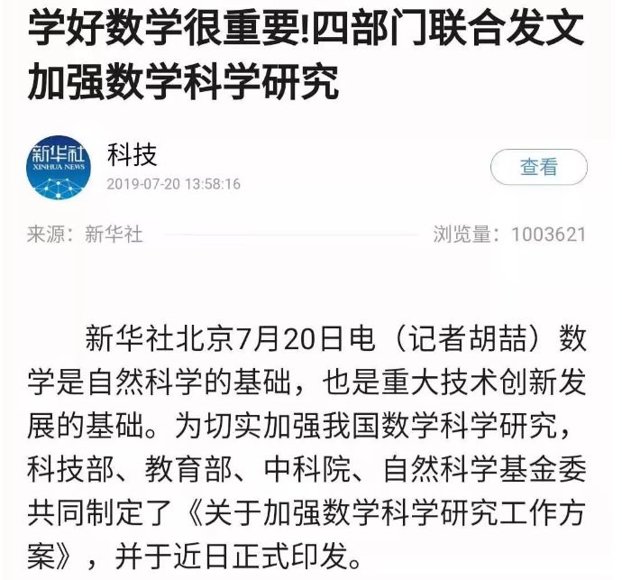 而且,紧随着夺冠的消息,新华社又报道了“四部门联合发文加强数学科学研究”、“全面提高义务教育质量”的新政策,数学作为理工类的基础学科,重要性明显要被提的更高了。