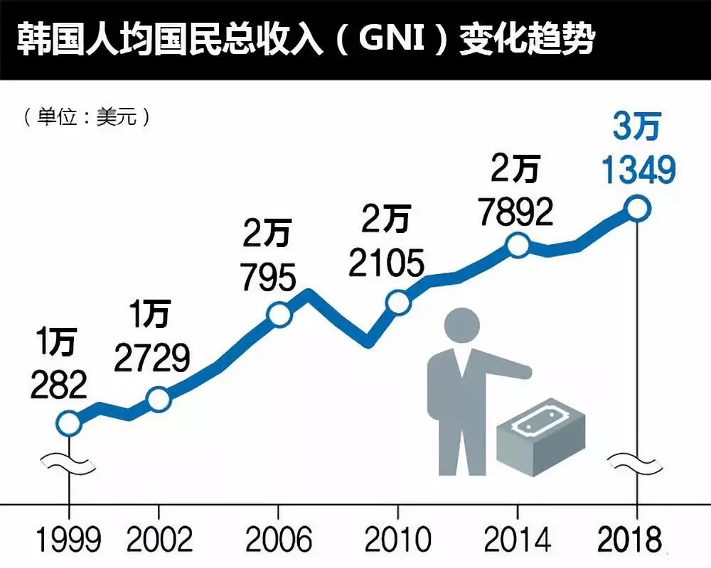 这一天,韩国银行发表《2018年第四季度及年度国民收入(暂定)》正式宣布,韩国人均收入比前一年增加了5.4%,达到3.13万美元。这距离韩国跨越人均2万美元门槛,仅12年。