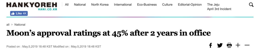尽管文在寅是一个愿意和国民们一起喝啤酒的总统,但国民却无法对糟糕的经济视而不见。截至2019年4月,文在寅的支持率已经从他担任总统时的84%下降到45%。