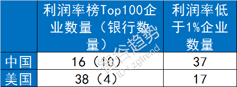 相比之下,美国有39家企业进入利润榜的Top100,其中银行只有4家。更多的是电信、科技、医药等企业。