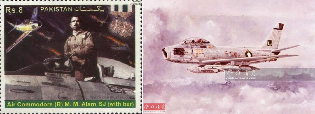 (图为巴基斯坦为纪念此次战果发行的邮票,右边油画是阿拉姆的F-86座机)
