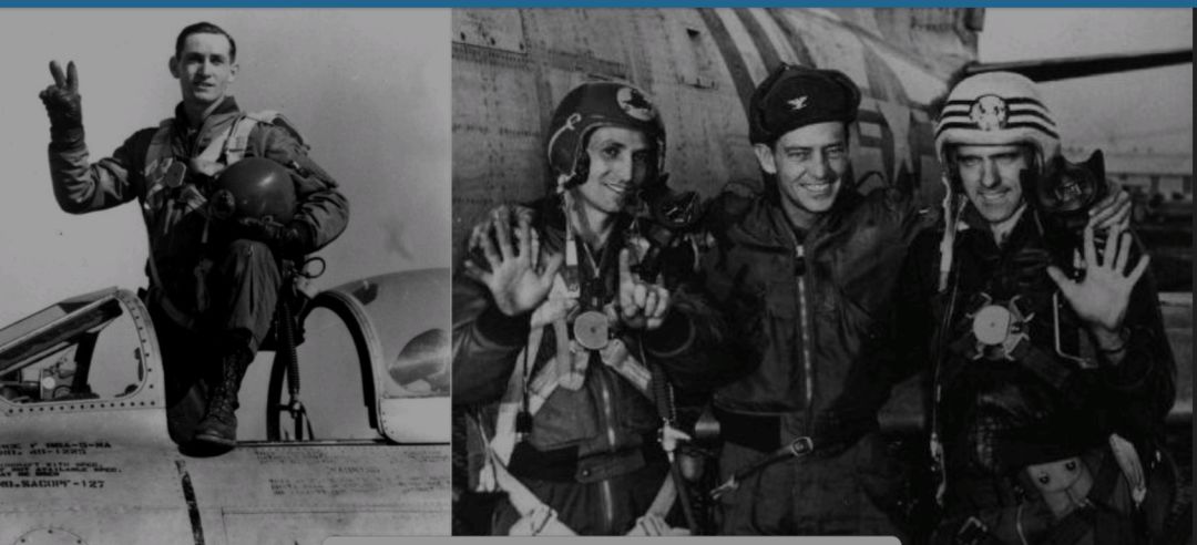 (图左为戴维斯,右为他和其他美国飞行员庆祝在大和岛偷袭志愿军成功)
