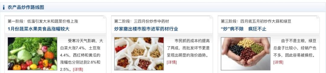 在2010年的“蒜你狠”、“豆你玩”涨价潮中,凤凰网绘制出了一条农产品炒作路线图,从第一阶段的“低温引发大米和蔬菜价格上涨”、第二阶段的“炒家撤出楼市股市进军药材行业”、到第三阶段的“四五月底炒作大蒜和绿豆”。