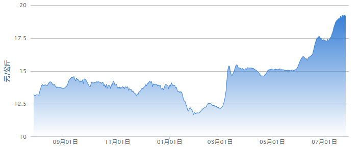 统计局数据显示,7月中旬生猪价格已经涨到了18.6元/公斤,创下35个月的新高。7月26日最新数据显示,生猪价格已经达到了19.16元/公斤。