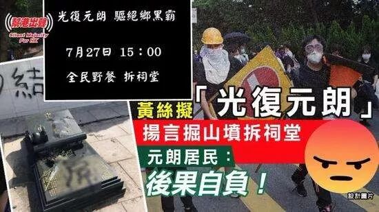 元朗群众出手,非常给力,堪比大陆的朝阳群众,两个事,冲击中联办,让我们很愤怒,很生气,但是元朗白衣人的义举,让我们感觉非常解气。于是,吃了大亏的港独分子展开了疯狂的报复,不但砸了爱港爱国的立法委员何君尧的办公室,还毁了他父母的坟墓,仅仅是因为他当天路过元朗,跟几位穿白衣服的支持者握手了。