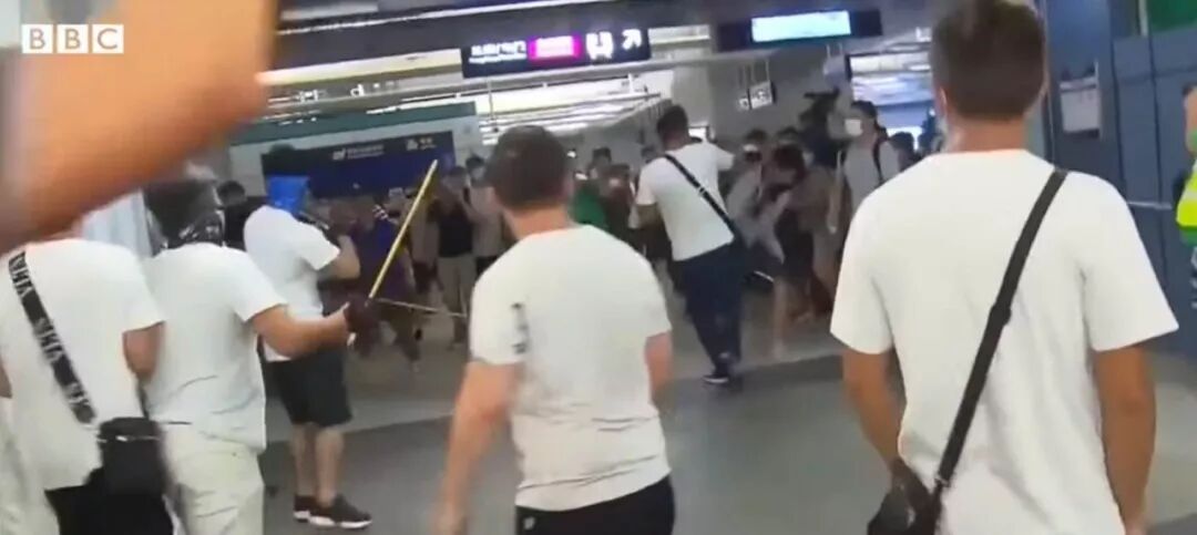 同一天晚上,元朗区还发生了一场白衣人与黑衣人的“黑白大混战”。我相信许多人都看过图片和视频,一群拿着藤条的白衣人追打前来游行示威的黑衣人,特别是在地铁站里面,打得黑衣人抱头鼠窜,落慌而逃。事后统计,黑衣人有45人受伤,其中有15人住院。一句话,黑衣人被白衣人打惨了。