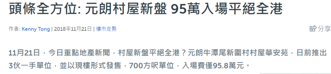 最后,元朗的房价很低,低到什么程度呢?低到100万港币可以买一套村屋。这是什么概念呢?这个房价要比香港太平山顶的豪宅便宜一百倍,没错,就是一百倍,太平山顶的豪宅最高卖到132万港币一平米,而在元朗最低只要13000块钱一平米!