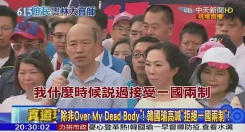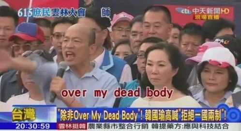 而两岸未来关系能否有突破,将取决于韩国瑜对92共识一个中国的态度。但就在前两天,受到香江局势的影响,韩国瑜6月15号竟然在云林大会现场声称,他绝对不会接受一国两制,除非、除非、除非,『OVER MY DEAD BODY』(踏过我的尸体)。
