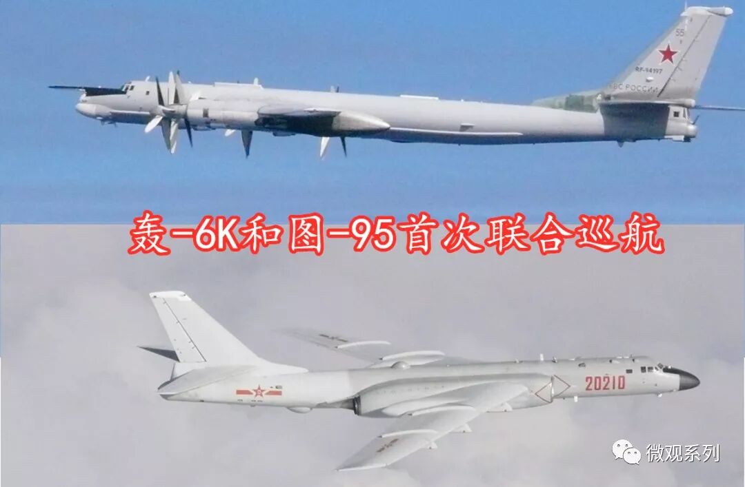8:33分,中国两架轰6K与俄罗斯两架图95轰炸机,空中会和,