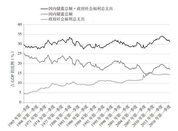 图1 储蓄和政府社会福利季度图表「1965年第一季度至2017年第四季度」
