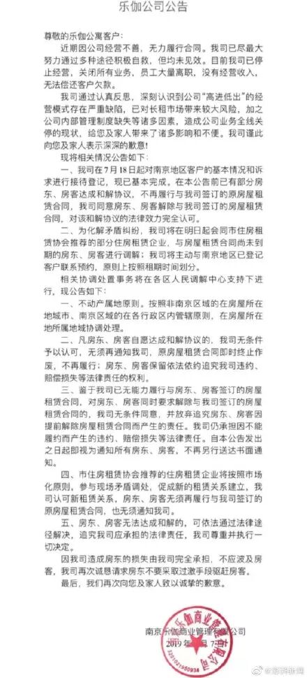 8月7日,长租公寓运营品牌乐伽公寓发布公告称,因公司经营不善,无力履行合同。