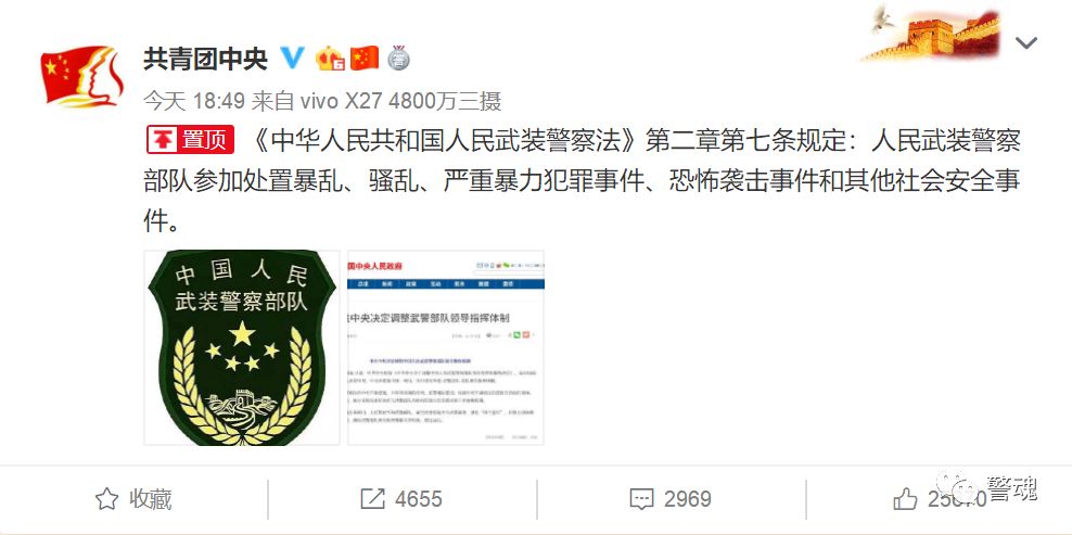 其五,共青团中央置顶微博,列举涉及武警的法律。这太反常了!