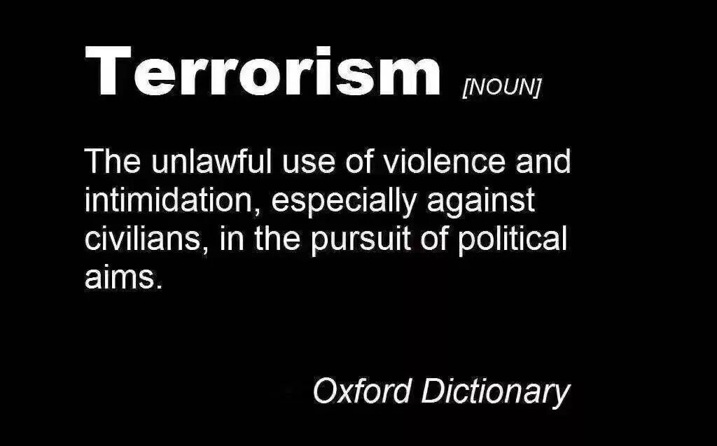 牛津英语大词典对恐怖主义的定义:为了一己政治目的,对别人特别是平民,采用非法的暴力和恐吓手段。