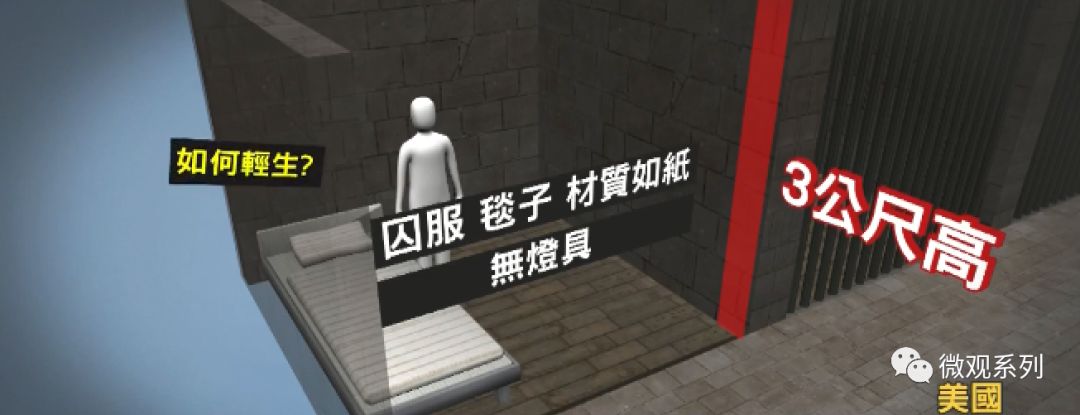 而且牢房天花板高3米,天花板上没有灯,天花板是平的,没有任何可以用来系吊绳的地方
