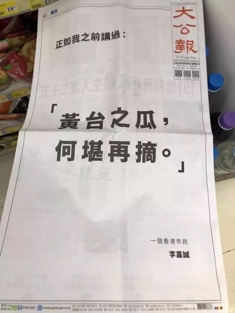 刊登在《大公报》头版的广告则更加简洁:“正如我之前讲过:‘黄台之瓜,何堪再摘’”,“一个香港市民:李嘉诚”。