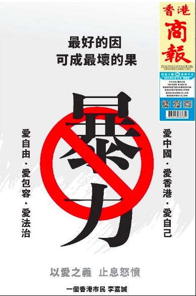 声明正中间为一个禁止暴力的图标,左侧写着“爱自由·爱包容·爱法治”,右侧写着“爱中国·爱香港·爱自己”。正上方的标题则为“最好的因 可成最坏的果”,下方写有“以爱之义止息怒愤”,署名为“一个香港市民 李嘉诚”。