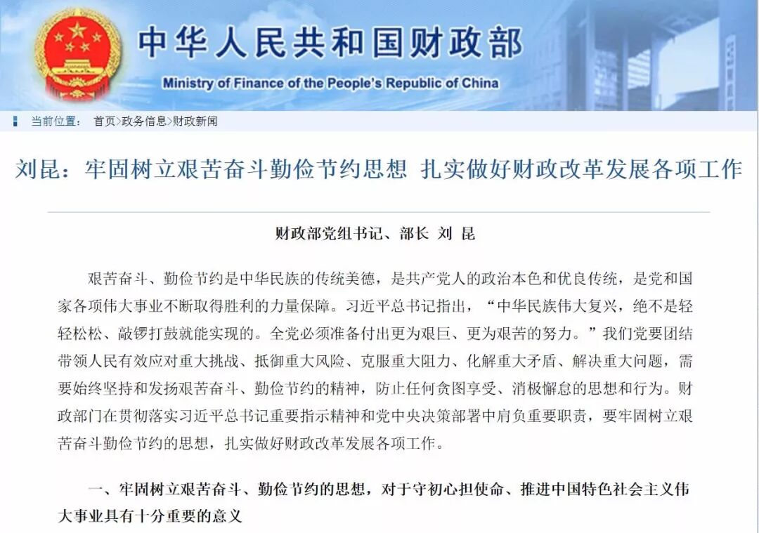 在财政部官网上,我查到了这篇题为“牢固树立艰苦奋斗勤俭节约思想扎实做好财政改革发展各项工作”的文章。