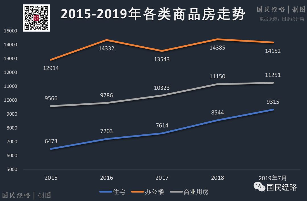 抛开个别城市,单看国家统计局数据:从2015年到2019年7月,全国住宅均价从6473元上涨到9315元,涨幅高达44%。