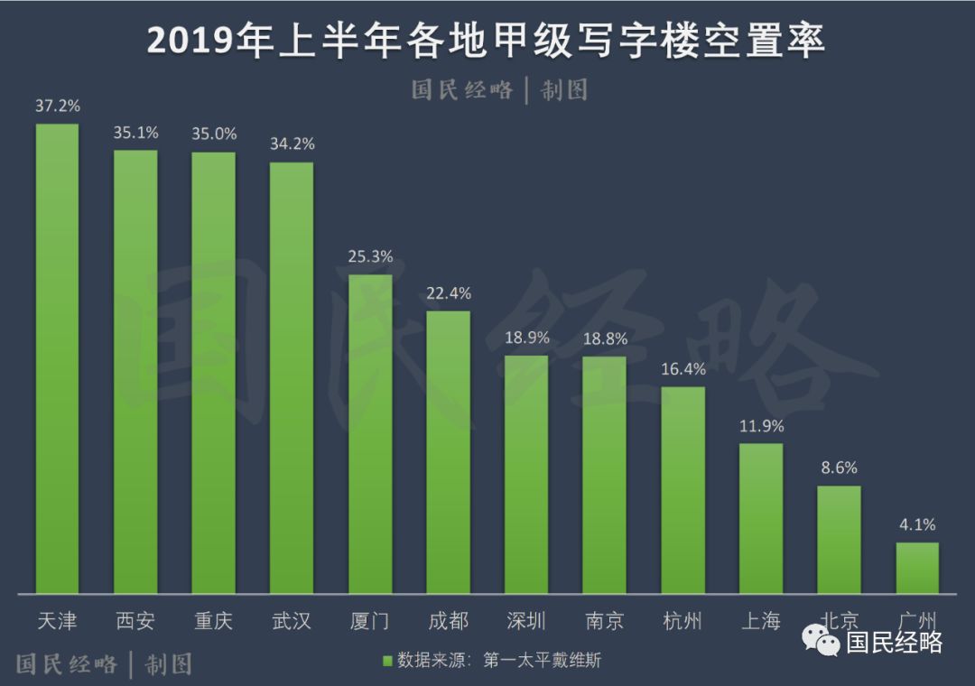 根据第一太平戴维斯数据,天津、西安、重庆、武汉四地的写字楼空置率超过30%,厦门、成都超过20%,深圳、杭州、上海超过10%,只有北京和广州低于10%,广州只有4.1%。