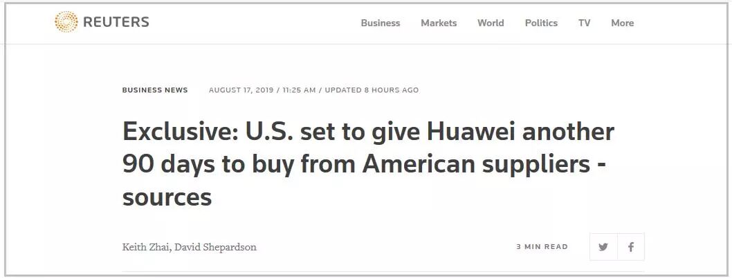 ——据知情人士称,美国商务部预计延长一份即将失效的协议,允许华为继续通过采购美国公司的产品来维持维护现有网络、设备以及客户。这已经是华为被白宫列入制裁清单后,第二次获得临时采购许可证。5月15日,特朗普动用国家紧急状态,将华为及其70个分支机构列入实体清单。仅仅天后,美商务部就允许华为在90天内继续购买美国厂商的产品。在六月底的大阪会议上,作为中国采购美国农产品的交换,特朗普就允许美企供应商继续向华为供货(当然,这种豁免对华为产品的意义并不重要,主要是能有利于华为稳固全球市场)。如今,华为继续获得豁免权,这足以说明美国在经贸战中的疲软之势。有两个方面的因素:一是美国经济出现了大问题,预计年底会爆发金融危机,而经贸战更使其雪上加霜,详情可参考前文《中国大反击的微妙》。二是手中没有制衡中国的牌了。对中国剩余3000亿美元产品增收10%的关税,是美国最后的牌。如果特朗普还要继续打,只能采取全面限制半导体出口的方式。