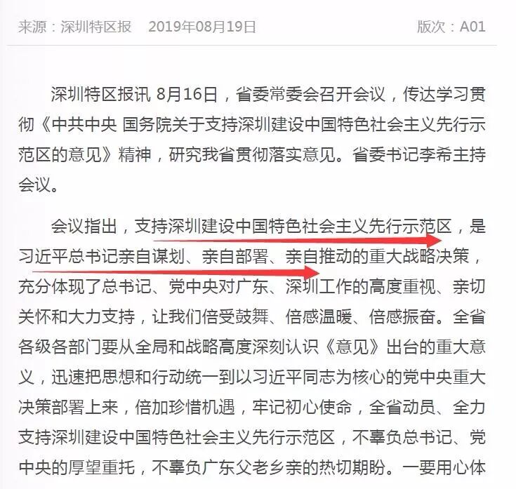 8月18日,关于深圳的“意见”印发后,广东省委常委会马上学习贯彻相关精神,在新闻通稿里有这样的表述: