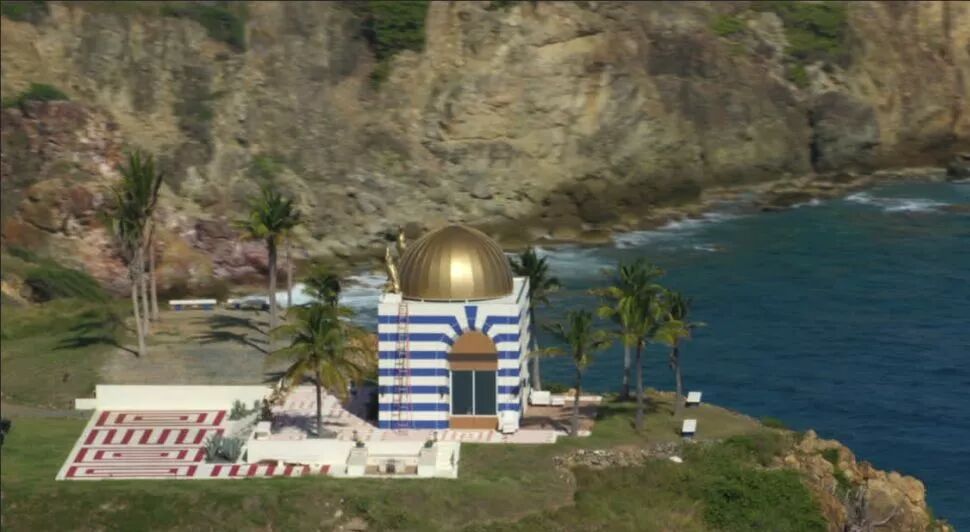 在岛上,他并建造了占地24000平方英尺的别墅,两个大游泳池和一个奇怪的蓝色条纹结构建筑。