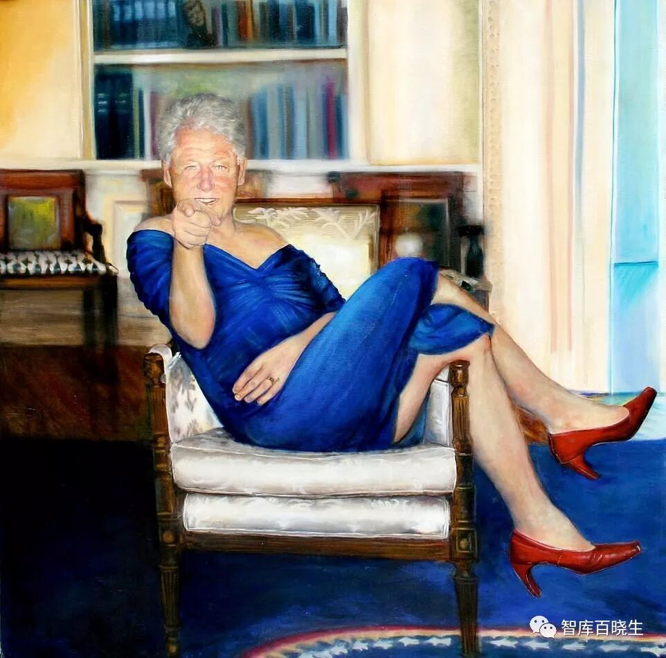 墙上挂着一幅油画,画中比尔·克林顿动作诡异,穿着蓝色裙装和鲜红色的高跟鞋。