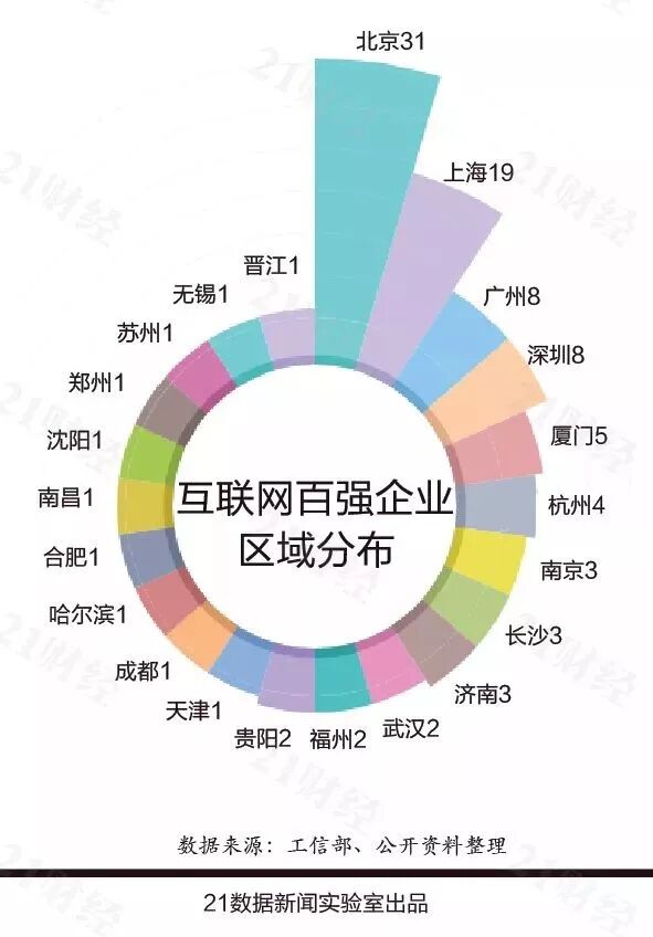 从这份榜单里,我们可以看到互联网经济的城市格局之变。北京(31家)、上海(19家)、广州(8家)、深圳(8家)、厦门(5家)、杭州(4家)、济南、长沙(3家)、武汉、福州、贵阳(2家)、天津成都哈尔滨郑州合肥等(1家)。