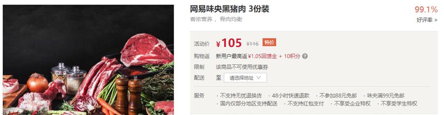网易的黑猪肉,3份装(350克*3)105块钱,一斤50块钱左右。