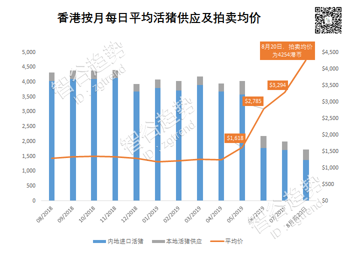 据香港食物环境卫生署,今年5月10日,香港检疫部门在内地输港活猪中查获了第一例非洲猪瘟病毒感染,港府因此销毁了6000头活猪,从此,香港人的口粮就出现了变局。从6月开始,内地对香港活猪供应量几乎腰斩,而拍卖价也飙涨了一倍。