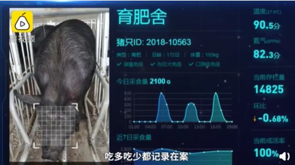 “一头黑猪晃晃悠悠地走到猪圈中间的喂食设备前,设备上的绿灯亮起,它如愿以偿地获得了今天的午餐。这台设备搭载的就是猪脸识别技术,设备前用铁栏杆架设出了一个小通道,仅能容纳一头猪,前端配了一个摄像头,猪进来后,通过面部识别,判断这头猪一天的喂食量来进行喂食,如果已经足量,这头猪就只能失望而返。”