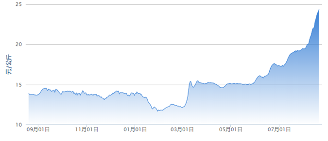 去年8月20日生猪(外三元)的价格是13.87元/公斤,一年后的今天,价格涨到了24.34元/公斤,相比去年上涨了75%。
