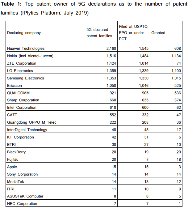德国专利数据公司7月份发布的最新数据,中国企业(华为、中兴、中国电信科技研究院、OPPO等)的5G专利数量遥遥领先