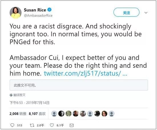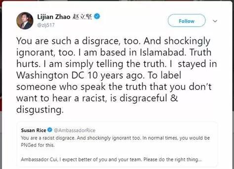 此文引起美前驻联合国大使苏珊·赖斯(不是美国前国务卿康多莉扎·赖斯)的激烈回应,她透过推特直呼赵立坚“你是个可耻的种族主义者,而且惊人的无知”。她还要求中国驻美大使崔天凯将赵立坚送回国。有意思的是,赖斯所掌握的信息实在太落后了。海姐查了一下,赵立坚是中国驻巴基斯坦使馆公使衔参赞。据悉,公使衔参赞的职位仅次于大使,高于一般参赞。也就是说,赵立坚在中国驻巴基斯坦大使馆是二号人物。