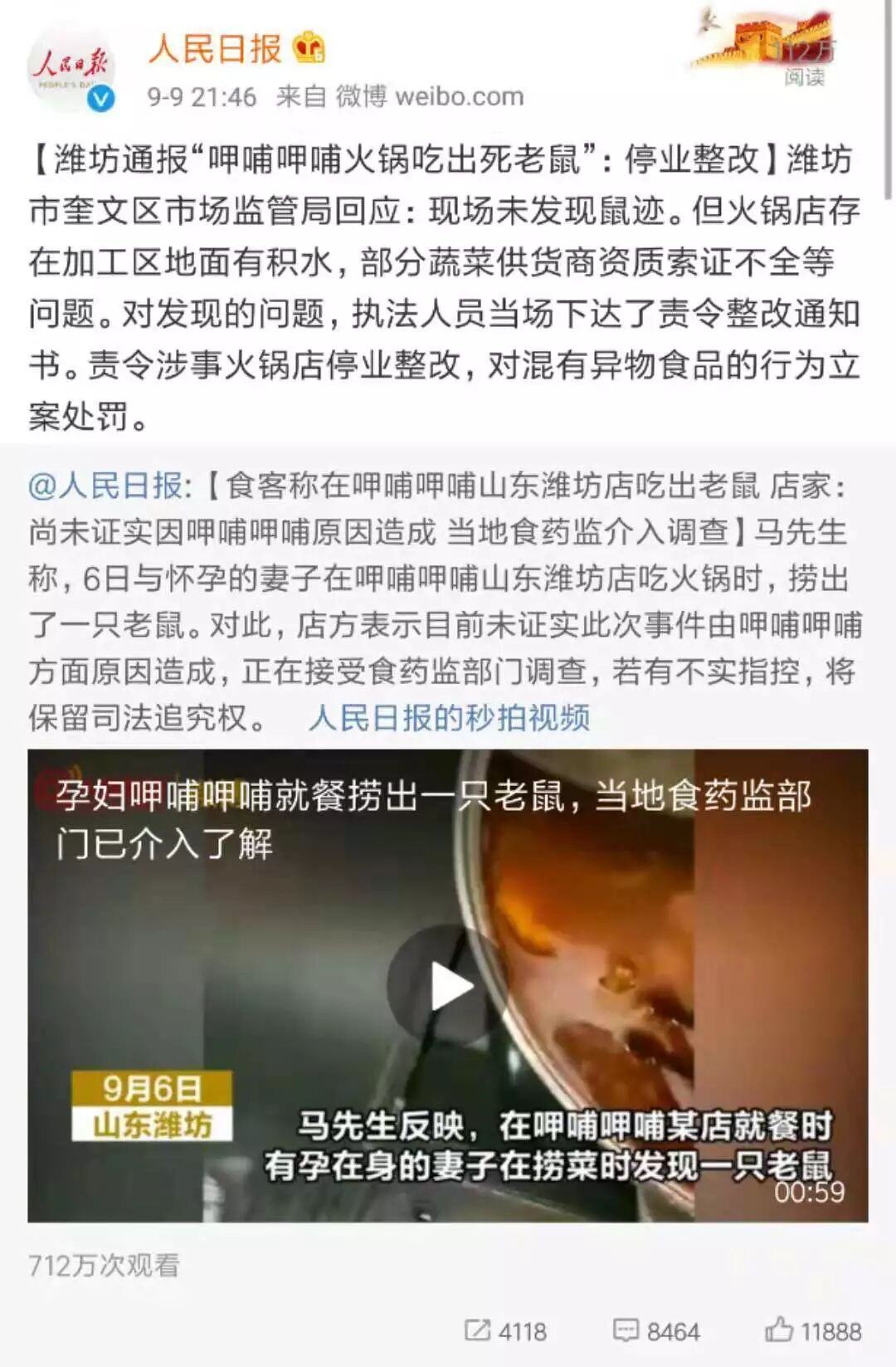 第二个案例是呷哺呷哺。2018年9月,潍坊市民马先生与妻子在呷哺呷哺泰华店就餐时,在汤底里捞出一只长度约为5厘米的死老鼠。