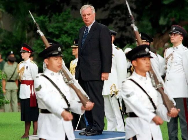 然而,让港人惊讶的是,这位末代港督一改殖民地传统,没有佩戴饰有羽毛的帽子、肩章、佩剑这些象征帝国荣耀威严的符号,只是身着便服、一脸微笑轻松地与市民们招手。