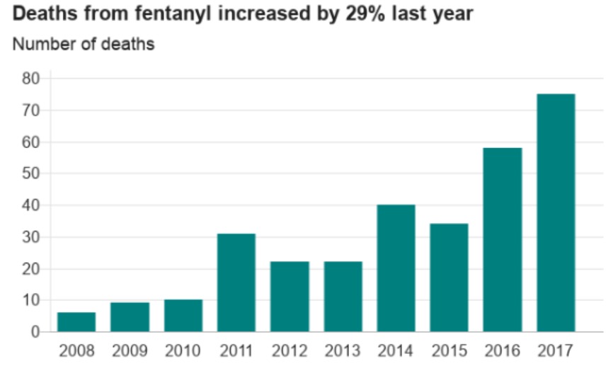 除此之外,卡芬太尼纯度极高,但制作成本不高,这意味着毒枭们可以用更少的重量和成本运输更多的毒品,从而赚更多的钱,这样就使披着海洛因外衣的卡芬太尼大量流入毒品市场。