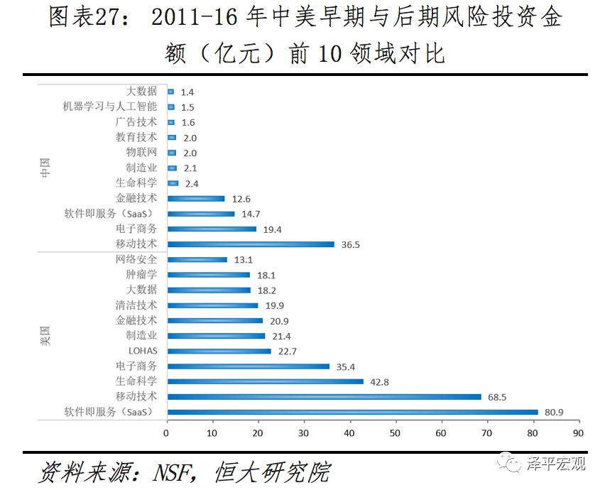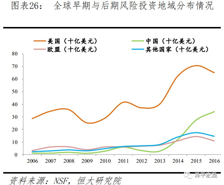 2016全球早期与后期VC规模中,美国达650亿美元仍然占到一半份额,其次为中国(340亿美元)、欧盟(110亿美元)。中国早期与后期VC活动显然比种子期VC活动更加活跃,近几年来规模由2013年30亿美元快速上升至2016年340亿美元,发展速度也远超过其他国家。总体来看,美国和中国已经成为全世界新经济最具活力的国家。