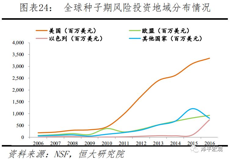 2016年全球种子期VC规模中,美国达33亿美元、占比超过一半,欧盟(9亿美元)和以色列(7亿美元)其次。美国种子轮VC投向的新兴领域中,机器人与无人机、人工智能、物联网、无人驾驶受到热捧,从绝对金额来看,人工智能成为当下VC最看好的方向。