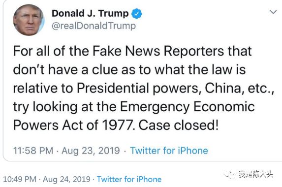 特朗普为了证明自己有这个能力,直接扔出了王炸,搬出1977年《国际紧急经济权力法案》(1977 International Emergency Economic Powers Act,IEEPA)声称,其“绝对有权命令”美国企业停止与中国做生意,并断言这就是“最终结论”。