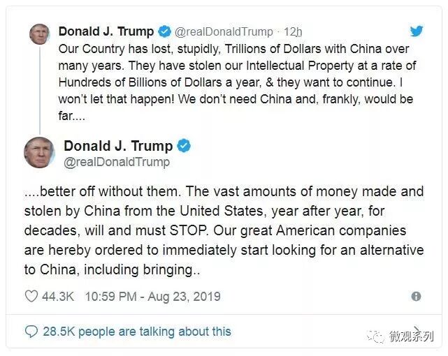 但问题出在特朗普随后发疯般的,连发十几篇推文中