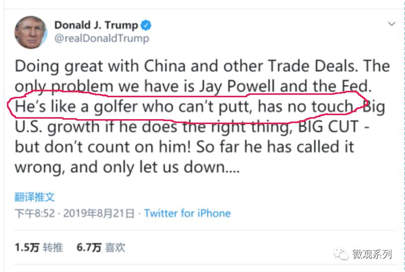 上周,特朗普形容美联储主席鲍威尔,是个无能的,不会推杆,也没有手感的高尔夫球手