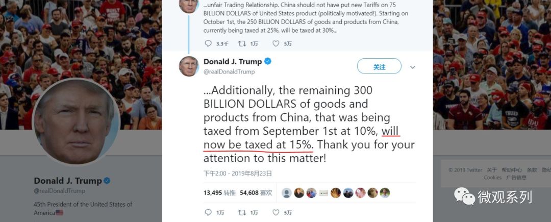 另外对9月1号和12月15号开始加征的3000亿美元商品,关税从10%,再度升高到15%