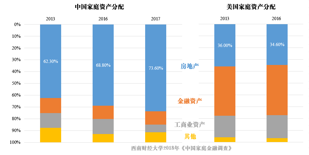 可以看出,中国人在房子里配置的资产,达到了惊人的73.6%,而美国这一比例还不到中国的一半。