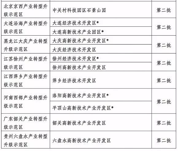 拟支持北京京西、大连沿海、黑龙江大庆、江苏徐州、江西萍乡、河南西部、广东韶关、贵州六盘水等建设第二批产业转型升级示范区。