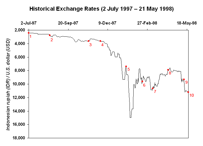在1997年7月用2400印尼盾可以兑换一美元,到了1997年年底,要用17000印尼盾才能换到一美元。印尼货币贬值六倍多。与此同时,印尼股票指数暴跌,1997年初向印尼投资100万美元,到了年底要撤退的话,恐怕只能卖上6万美元。
